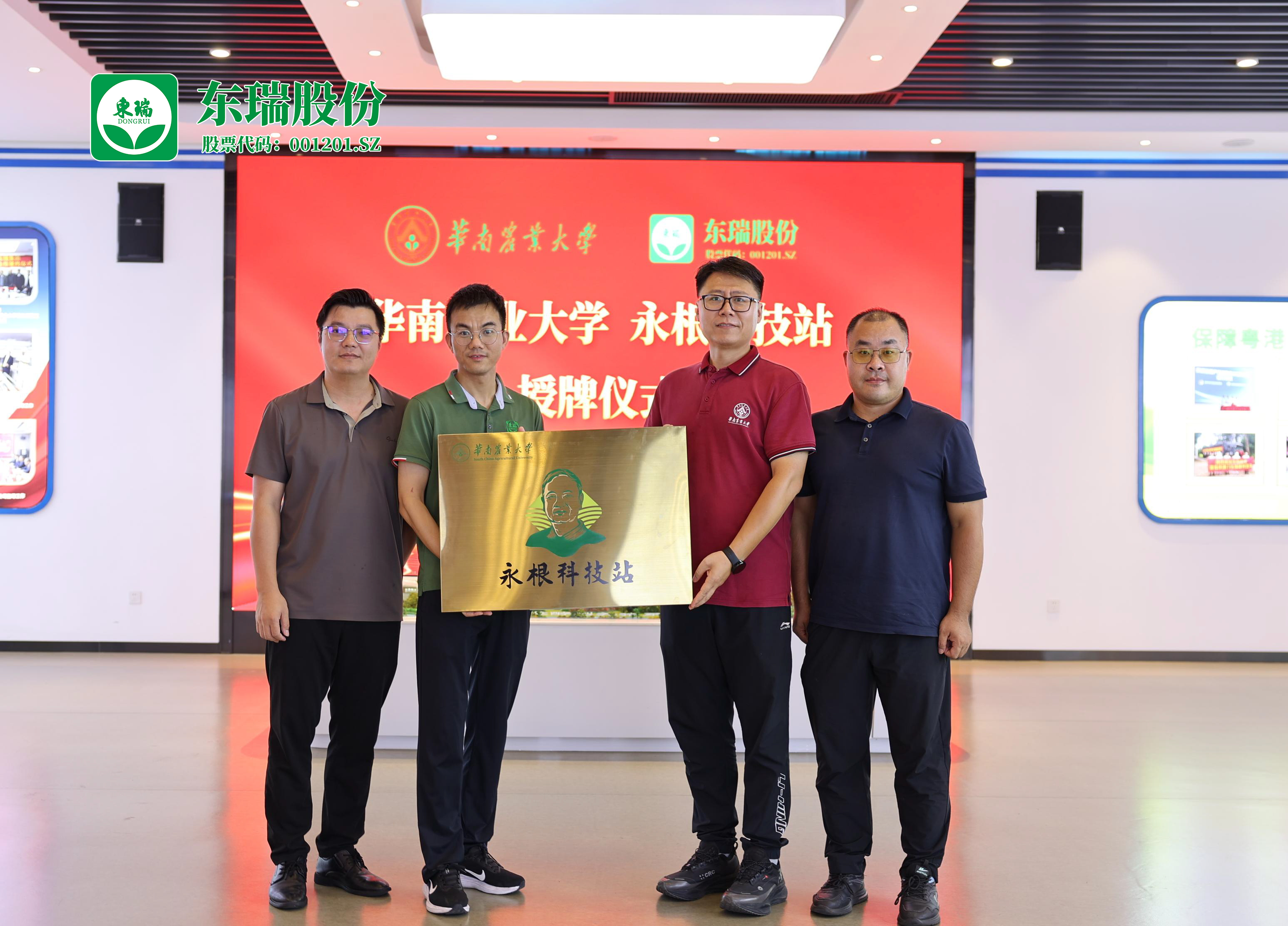 7月16日,華南農業大學獸醫學院專家代表王衡老師到東瑞股份舉行“永根科技站”授牌儀式,東瑞股份副總裁劉水平、證券投資部總經理謝志銘出席授牌儀式。